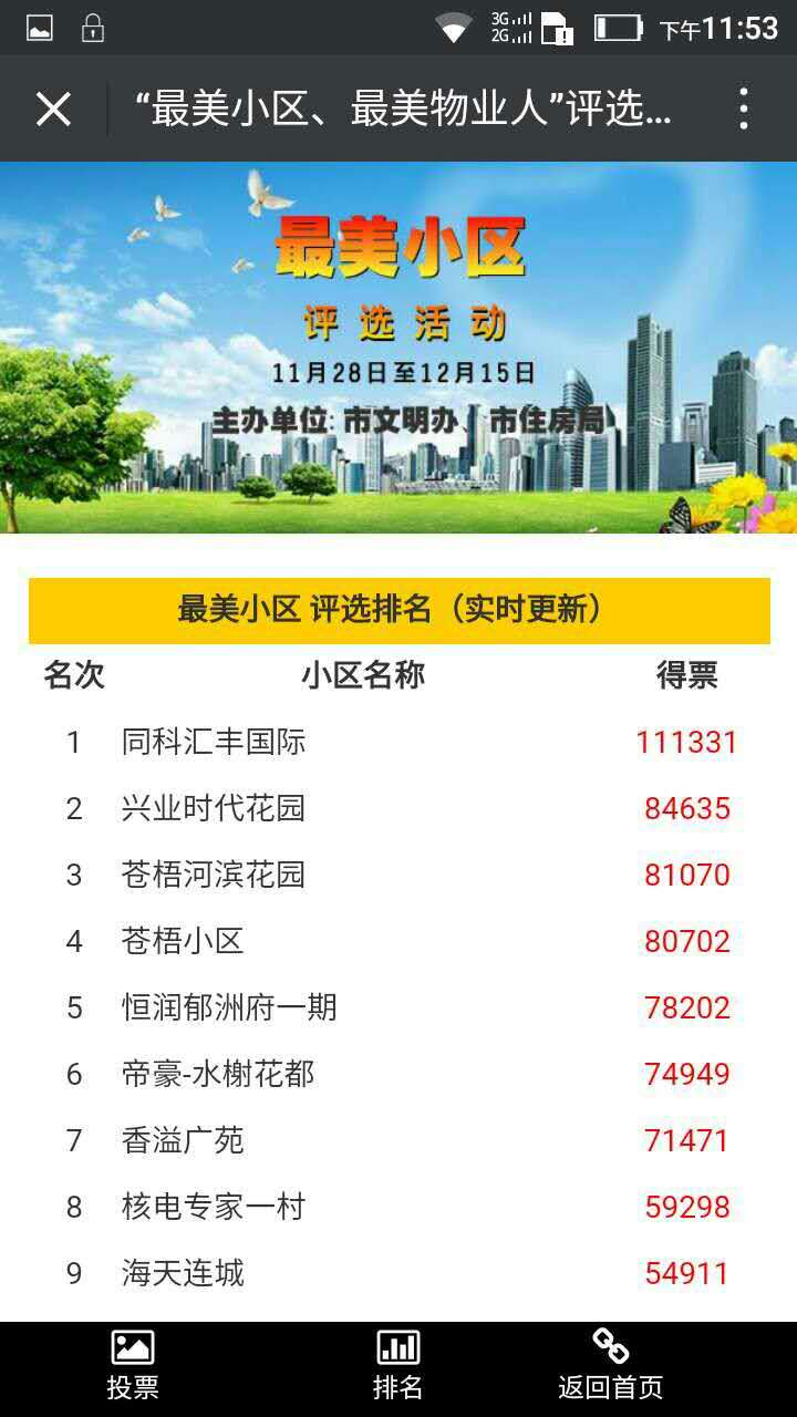 由市文明辦、市住房局主辦,連云港報(bào)業(yè)傳媒集團(tuán)、連云港廣電傳媒集團(tuán)、市物業(yè)管理協(xié)會(huì)承辦的《2016年度連云港市“最美小區(qū)”、“最美物業(yè)人”評(píng)選活動(dòng)》目前已經(jīng)進(jìn)入第五個(gè)階段專家評(píng)選階段,在11月25日-12月15日進(jìn)行的第四階段投票評(píng)選階段中,蒼梧物業(yè)管理的蒼梧河濱花園和蒼梧小區(qū)在30個(gè)候選小區(qū)評(píng)選者中分別獲得第三和第四名的好成績(jī)。