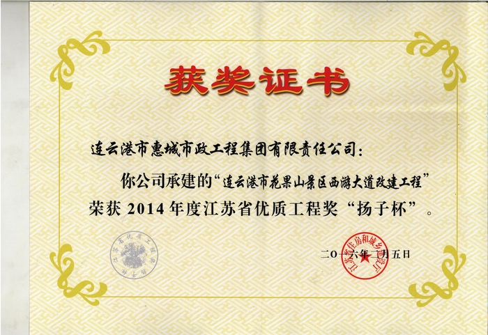 花果山景區(qū)西游大道改建工程榮獲江蘇省“揚子杯”優(yōu)質(zhì)工程