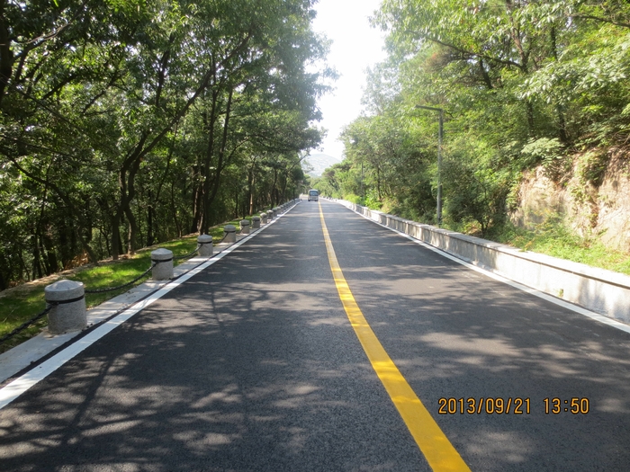花果山景區(qū)西游大道改建工程是2013年市委、市政府確定的重大項目之一。工程分為兩個段面,分別是山下城市性斷面和山上景區(qū)性斷面,西起原松門,終點為玉女峰廣場,道路全長12.08公里,道路鋪SMA改性瀝青砼,全線設(shè)上山游步道,更換蓋墻石、車檔。景區(qū)道路全線縱坡較大且彎道多,人行道設(shè)置靠山澗側(cè),施工位置險峻,施工難度大。工程主要難點是陡坡急彎的處理,保證完工后的西游大道通行順暢。山上攤鋪瀝青在連云港市是第一次,無成功經(jīng)驗進(jìn)行借鑒,全線坡陡彎多,瀝青收邊十分關(guān)鍵,經(jīng)過多次現(xiàn)場試驗和改進(jìn),實現(xiàn)了施工后的瀝青路面緊固、密實、美觀。此外,瀝青面層攤鋪還榮獲了QC小組頒布的《上山道路瀝青面層攤鋪質(zhì)量控制》成果獎。