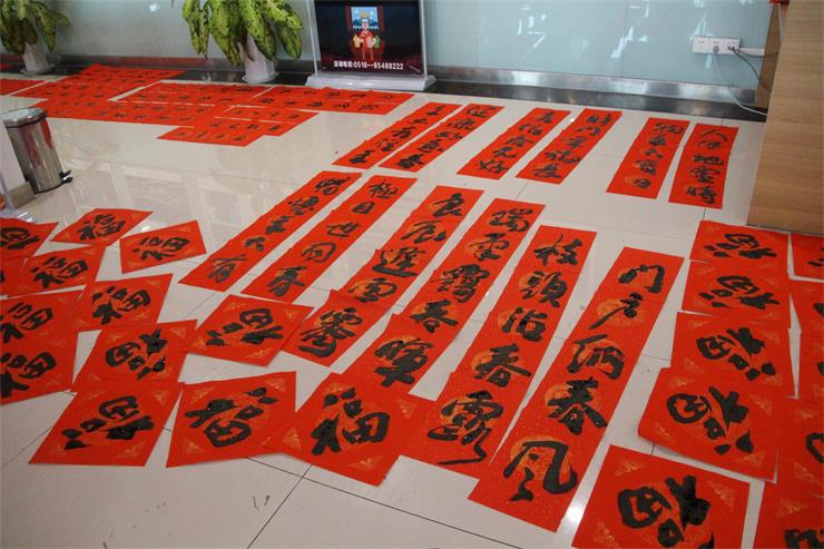 整個(gè)活動(dòng)過(guò)程中,連云港市書協(xié)的藝術(shù)家們?yōu)槌墙毓杉瘓F(tuán)書寫了近600幅春聯(lián)和福字,表達(dá)了藝術(shù)家們對(duì)城建人最美好的新春祝福。無(wú)聯(lián)不成春,有聯(lián)春更濃,集團(tuán)工會(huì)為城建員工送春聯(lián),不僅送去了新春的祝福,更是送來(lái)了優(yōu)秀的傳統(tǒng)文化;在這樣的活動(dòng)中,城建員工欣賞到了中國(guó)對(duì)聯(lián)的藝術(shù)和美麗,也提前體驗(yàn)到了新春佳節(jié)的喜慶與祥和。